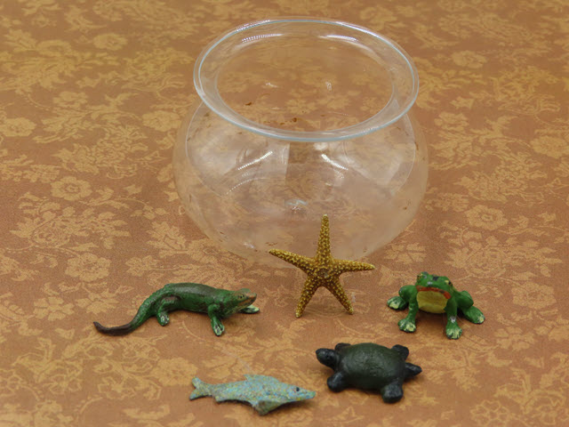 The fish bowl has fish and reptiles that are so detailed!! There is a fish, a