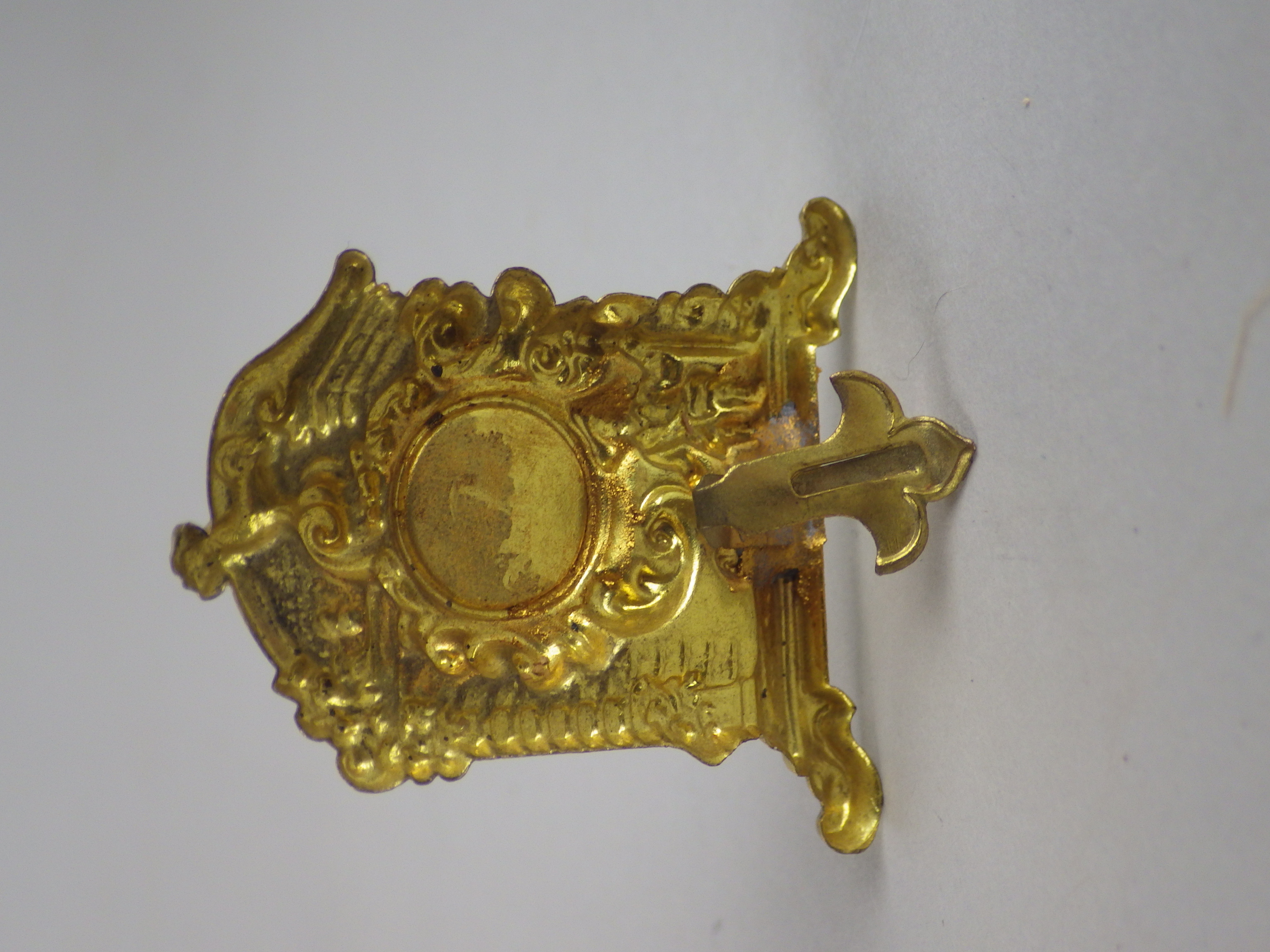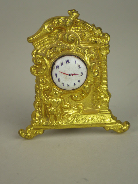 This ormolu clock is quite unusual as the face sets on a mound of scrollwork. If you look closer you will see a peacock on top of an entrance. You can see the brickwork of a building! Then below the clock face, over to the left, is a warrior guarding the building. Two small feet, one on each side of the clock, help to balance the clock with a tab on the back. The ormolu is in great condition, just as brilliant as the day it was made!