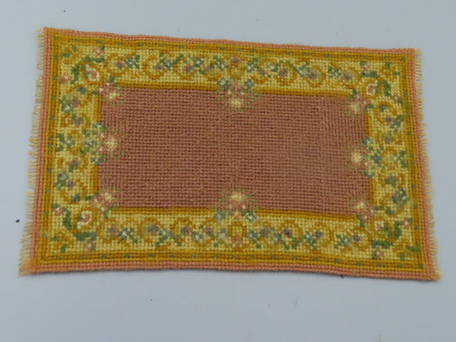 in gold, with a gray/green and cream background. The stitching or needlepoint