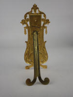 This ormolu thermometer has lovely scroll work at the top with fish heads on the sides. The borders on the sides of the thermometer become more extravagant with heavier scrollwork that frame the circular portrait of a lady. This piece balances on two feet and is held up in the back by a large support stick.