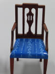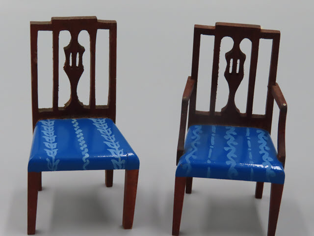 a side chair and an arm chair. The seats are painted a dark aqua blue with a
