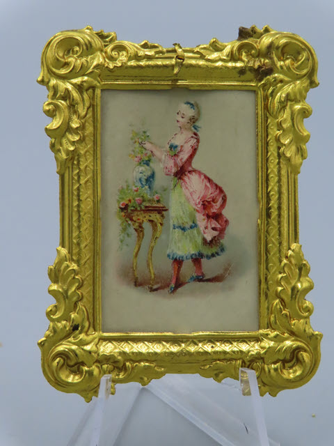 pink and a long skirt in blue. She is arranging flowers in a vase. The ormolu