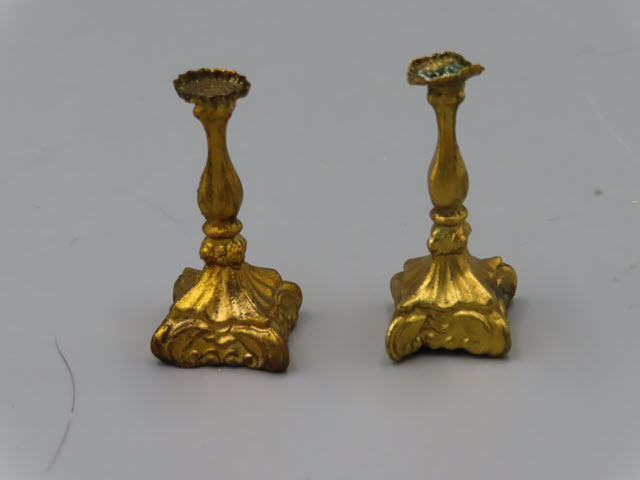A Pair of Ormolu Candlesticks This pair of candlesticks have a square decorative base. They are in very nice condition. Measurements: 1-3/4" tall Circa: 19th Century Price: $75