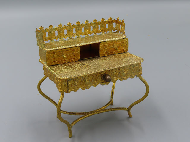 the writing area. The desk is supported by tubular curved legs. This would be an