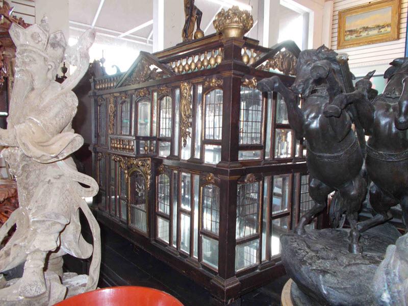 The roof is framed in dark wood that matches the rest of the house. Glass slanted panels are set in –one long one in the front and back. The sides have smaller panels of slanted glass. The very top of the house has a flat board to support the grand statue of a woman holding a pelican! The last photo shows her foot resting on a ball. The carving is just the finest carving I have ever seen with the detail of her hair and facial features!
