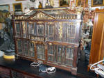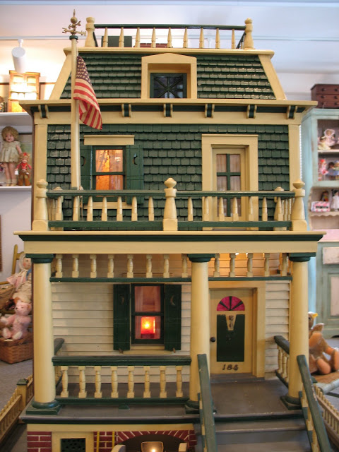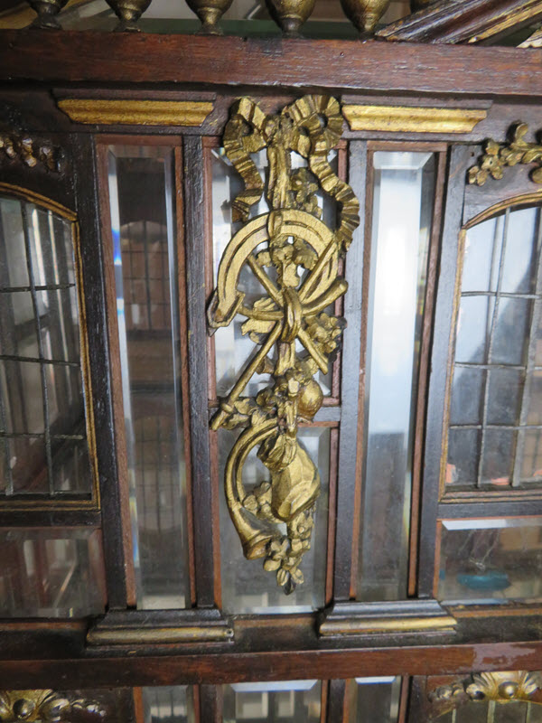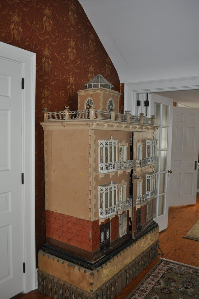 As a recent buyer of this house, I'm not familiar with its history or its actual age. The last time I saw this house, it was displayed at Lucy's Dolls' House Shop in Camden, Maine, when I visited a number of years ago. Each time I approach this house in my living room to get a better view, I discover additional openings or details I hadn't noticed before. All of the ornamentation is carved wood, painted gold. The carving work is so amazing I have photographed each of these fine pieces that you see painted gold. Incidentally, since the back of the house is made exactly like the front façade of the house, one enters through the front door (first floor) or you'd enter through the same door in the back. The side panels of windows pull out to enter the second floor on both the right side and left side.