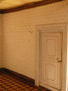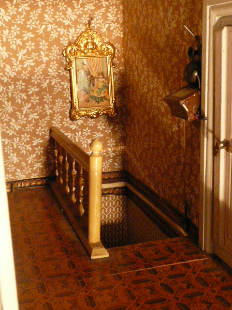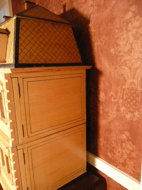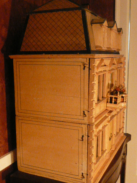 This Christian Hacker's Dolls' House is in excellent condition with its original paint and wallpapers. The exterior is painted a soft golden color with the trim work a few shades darker. All of the window treatment and painted decoration is as clear as if it were new. The raised quoining, painted lined windows, the original mansard papered roof, double door entrance with ormolu door knockers, the original curved balcony -are all intact. House opens from the front to reveal 4 main rooms and two halls with a staircase and railing. The 3rd story is removable and contains two rooms with original wall and floor papers. The main part of the house has all its original wall and floor papers, original curtains with papered borders over each wooden bracket, painted ceiling medallions, and inter-connecting doors with butterfly knobs making it possible to lock each door. Kitchen has a built in stove unit (stove is a block of wood with red brick paper) and a wonderful cupboard to display dishes. The house retains its original chimneys too. Measurements: 37"h. x 31"w.x 16-1/2"d. Circa: 1880 Price: SOLD For further information, please email me at -antiquedh@comcast.net |