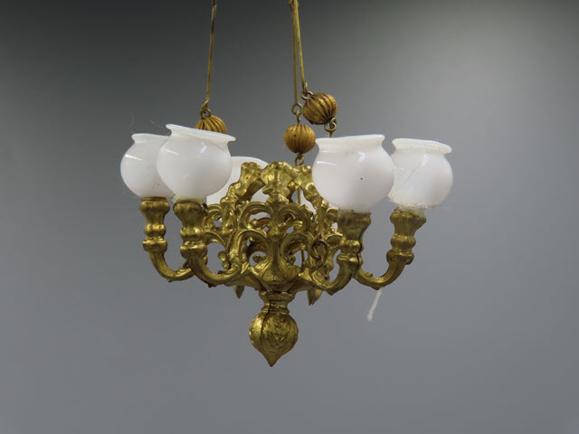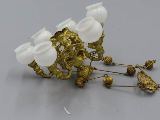 The ormolu is in excellent condition and is a bright gold! The center piece is filled with filigree and then has arms that extend outward for the globes to be placed on. There are three strands of gold wire with round bead/like forms that give the weight to hold up the lighting fixture.  The round holder at the top has a tiny wire to hook on for hanging.
