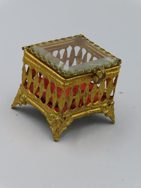 The ormolu is strong and brilliant! The top is glass and when opened one