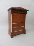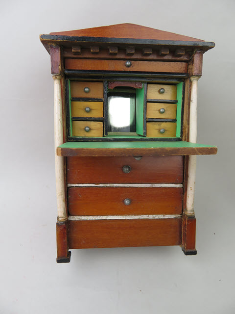 If you go into the early furniture for dolls' houses, you would see the name Kestner. Three colors are shown- the dark ebony, the light maple color and this color of the secretary – an orangey /light mahogany color. The carved white columns on the front corners, the drop front exposing a lovely interior with dentil molding at the top, several small drawers around a recessed center with a mirror. And green interior paper. A very nice piece!