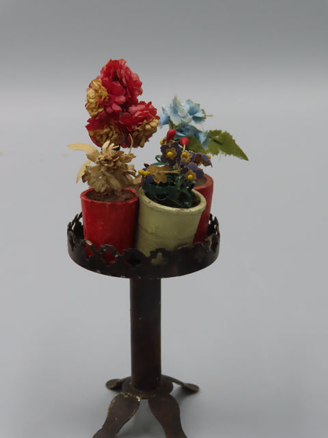 The stand has four extended feet and a center tube-like post extending upward to support a flat top with a pierced open frame that holds four potted plants. The potted plants have paper flowers with a heavy card pot! The potted plants are removable and can be arranged differently.