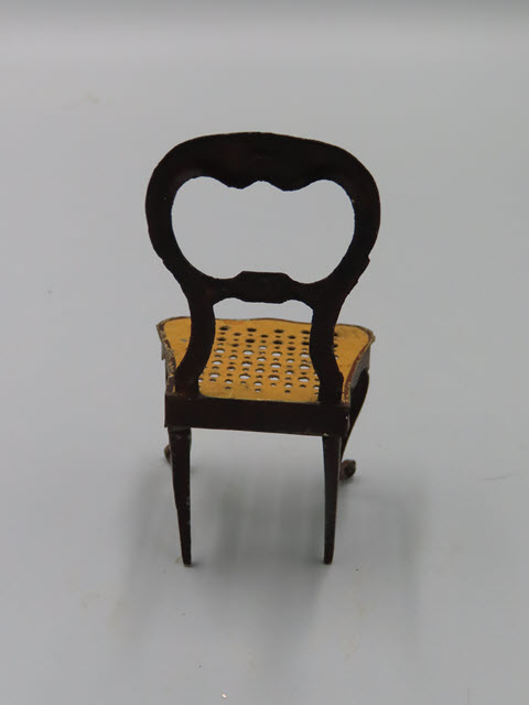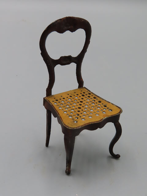 This chair is made of metal and has quite a bit of decorative elements! As you can see the seat has perforated holes to resemble weaving and the front legs are curved and have feet that point upwards. The framework is painted a mahogany brown and the back of the chair has impressed designs and thicker parts that give more decoration. This one chair would be nice for a desk!