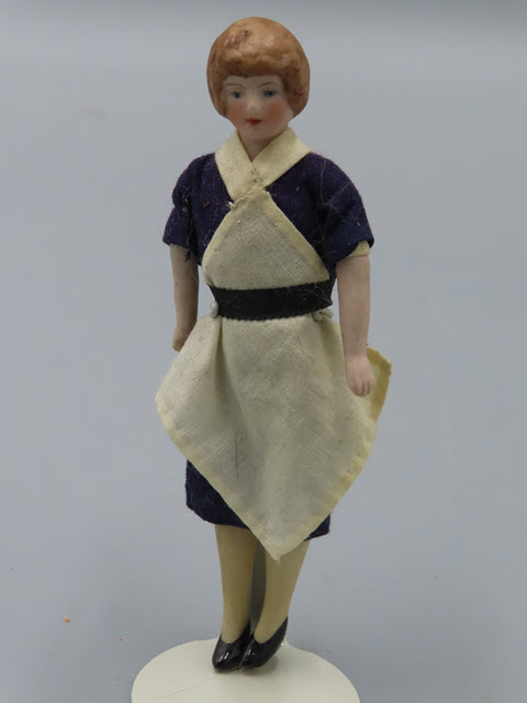 This doll is dressed typically like the 1920's-30's.She is wearing a black dress with a white apron. Her clothing looks fresh and clean as part of the apron at the top is sewn right on to the black dress. She even has her little black heels on!! Her hair has comb marks on the front of her face and is pulled back into a bun. She has icely painted facial features with blue eyes, red lips and rosy cheeks!