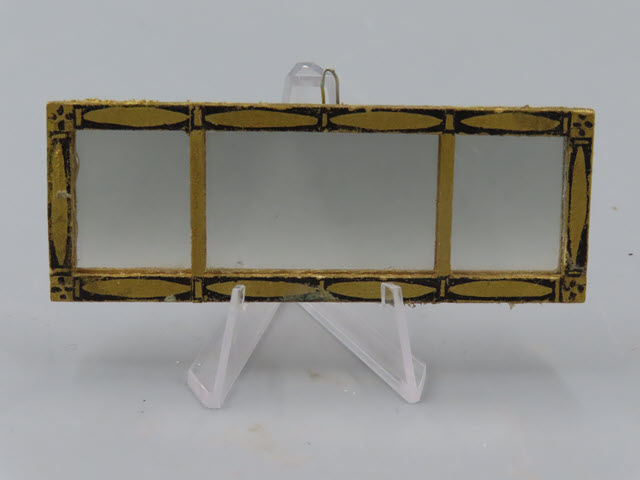 A Three Part Tynietoy Mirror The wooden framed mirror has painted parts in gold with black outlining. There is a hook on top of the mirror for hanging. Measurements: 1-1/2"h. x 4"w. Circa: 1920's Price: $50