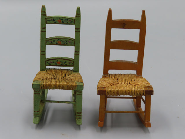 These can be bought together or separately! Both have rush seats. One rocker is a stained maple and the other rocker is a green with splats on the back that have flowers! Both are in excellent condition.