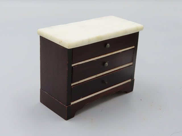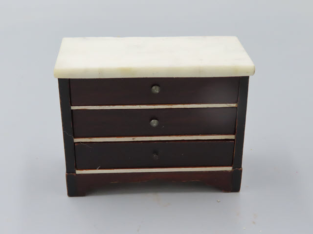 A Kestner Bureau This bureau has a marble top and three drawers. It is in fine condition with white strips between the drawers. Measurements: 3"h. x 4"w. Circa: Early 19th Century Price: $110