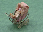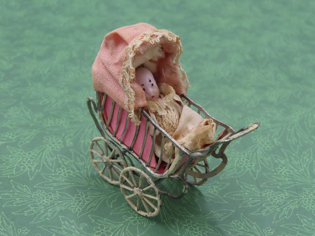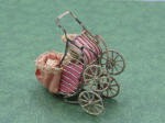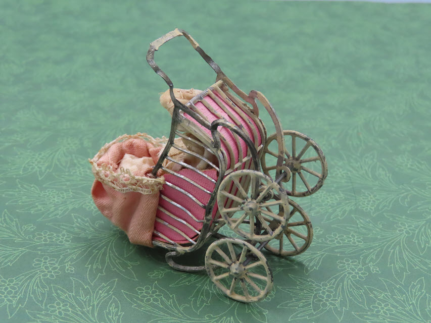 The doll carriage has pink lining and a pink hood. A small bisque doll is laying inside the carriage. All the wheels work and there are no broken parts or any parts missing.