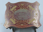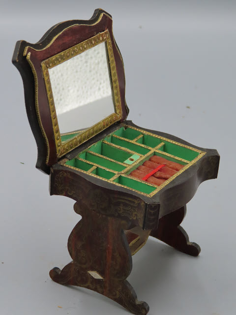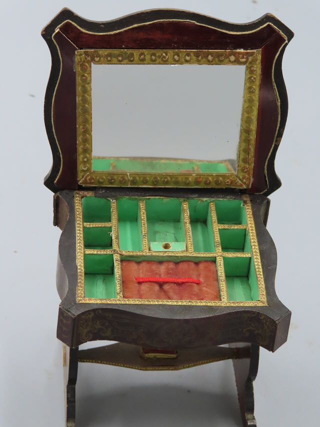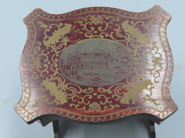 The top on the sewing stand lifts up to reveal the interior which has compartments to hold sewing tools or sewing pieces. A mirror trimmed in gold paper is glued under the top of the cabinet. The entire piece has the Boulle designs. The top or cover to the stand has a wonderful design that shows a building in the oval center. A fancy design encompasses the rest of table top. The sides have lots of gold transfer work with a cut out white diamond on each side. A thin strip of gold paper surrounds the mirror and also outlines all the little compartments. When the lid is opened, a mirror outlines the interior. A strip of wood joins the side legs.