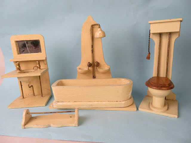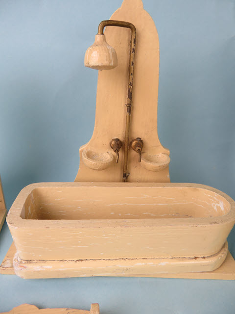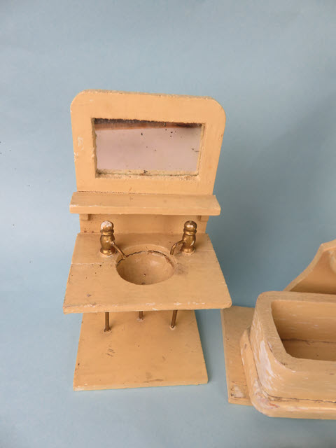 water!!! On the top of the basin is a mirror in a frame. The high tank toilet is