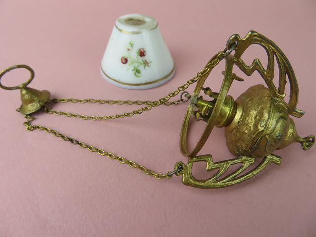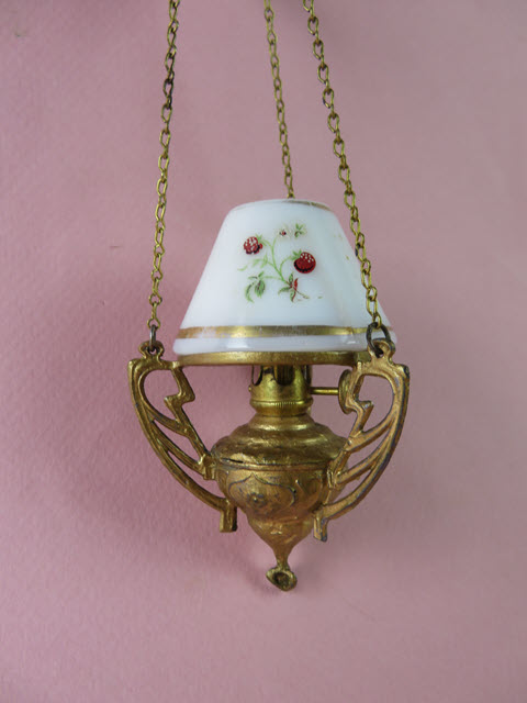 This chandelier has a great base with three brackets or holders made in the fashion of Art Nouveau. They are attached to the round rim that holds the white glass shade which is marked on the rim "Made in France". There is a gold painted line that goes around edge of the shade and then there are red strawberries or flowers drawn around the shade with some light greenery. The wick goes up and down when the knob on the side is turned. The large holder at the base of the chandelier would hold the kerosene. The chandelier, chain and holder (ring at the top) are all painted gold. A lovely piece for your collection.