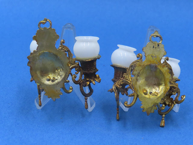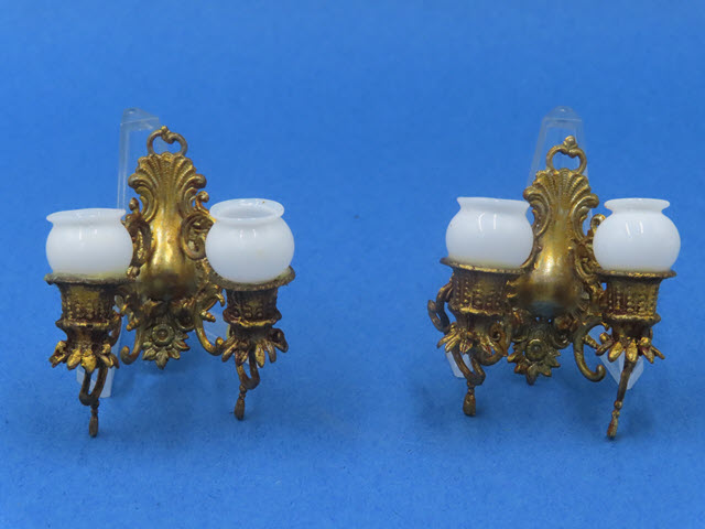 White glass globes are attached in both sockets. The sconces are made of a soft