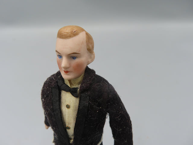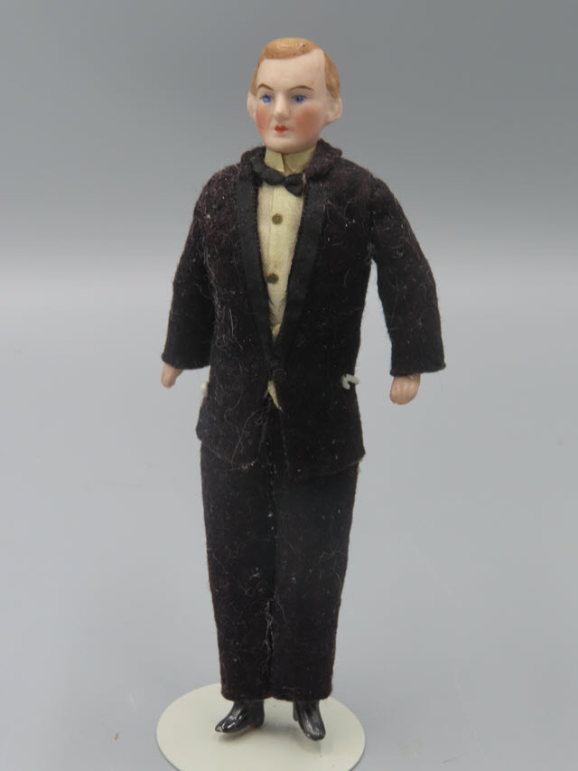 ears too!) He is wearing a black felt suit with a white shirt and a bow