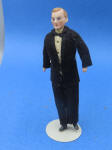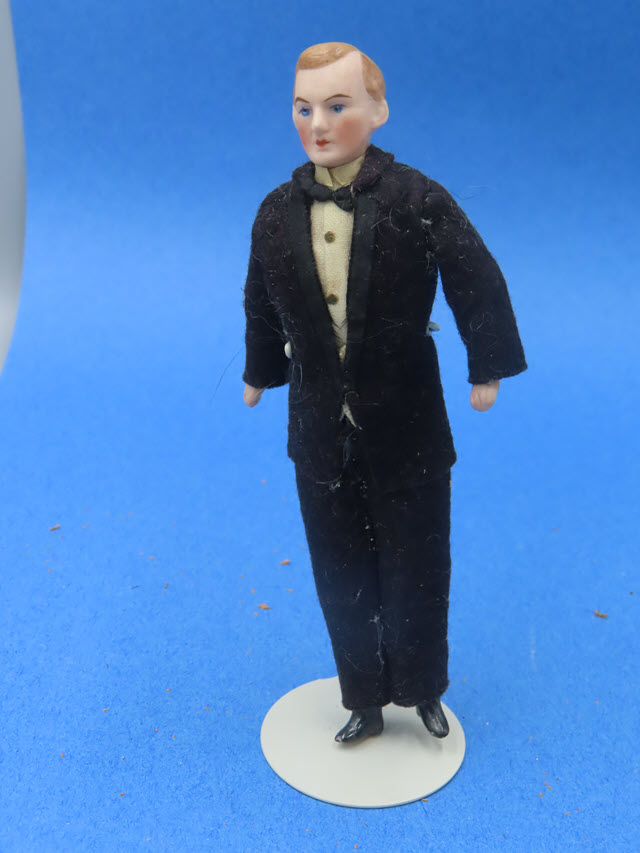 The gentleman has blond hair and is wearing a black suit with a white shirt and black bow tie.