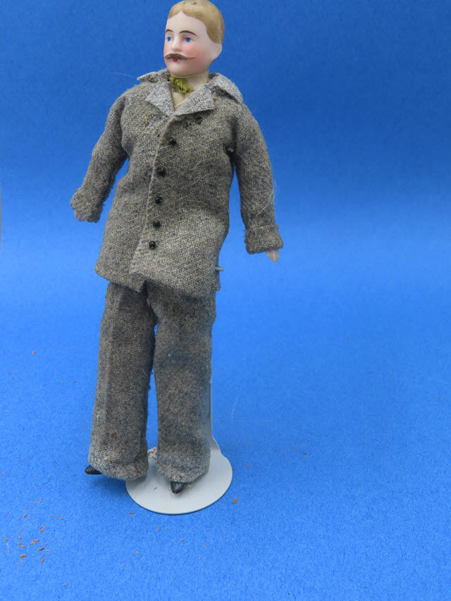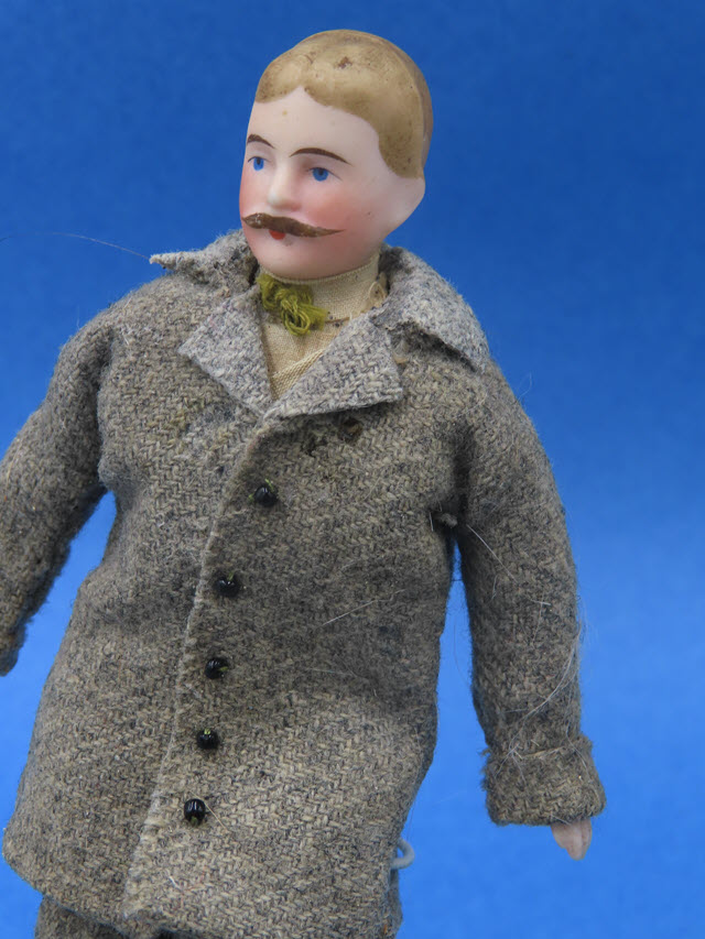 He has light brown hair and a mustache, with pink cheeks and blue eyes! He is wearing a tweed suit. I would hem his sleeves and his pants a little. He's a great man too!