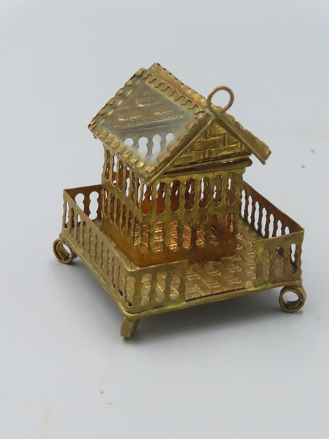 This ormolu birdcage sets on a base with a fence around it. An opening in the front allows an entrance.