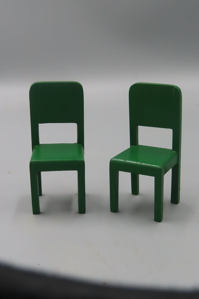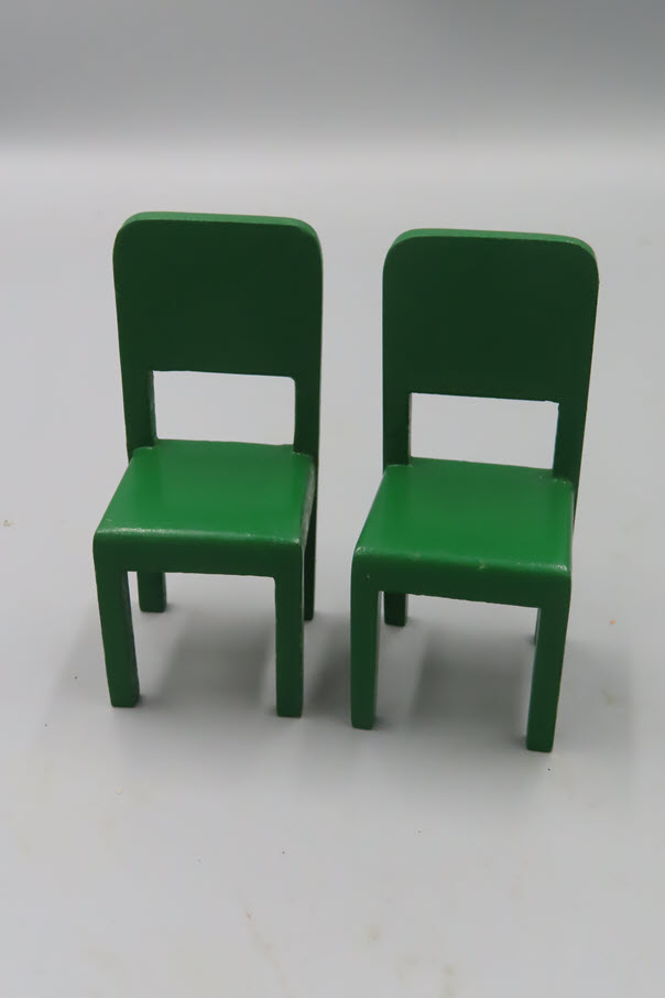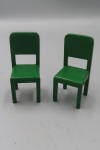 Two Green Tynietoy Chairs These two chairs were made by Tynietoy and are in mint condition. They originally were found in the maid's room in a Tynietoy dolls' house. Measurements: The chairs are 3-5/8" tall. Price: $25 each.
