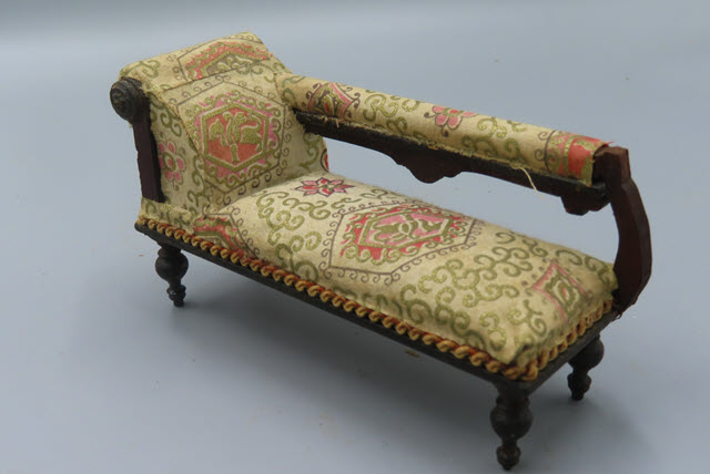 A Very Unusual Chaise Lounge The fabric has beautiful design work in shades of pink and gold motifs on a cream background. There are four short turned legs. Measurement: 3"h x 5-1/2" long Price: $60