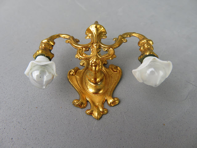 This sconce has a brilliant shine to the ormolu with two hanging lights pointed downward which is the right position. The white shades are a Bristol glass and have clear bulbs. This piece would certainly brighten up a room on a wall! (Note: I may have another one which would be very nice with one on each side of a fireplace).