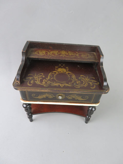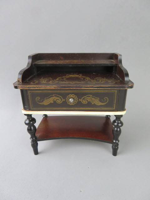 I believe that it is the gold transfer work that appears on the flat table surface, on the drawer and on the shelf that gives it such a rich appearance. The side panels that enclose the top area are carefully proportioned, the lovely drawer that is rounded on the sides and the great turned legs which are attached to a shelf – make an outstanding piece. The white banding under the drawer just enhances the piece. The staining is rich and dark! Excellent condition. (It is finer looking than the photo)