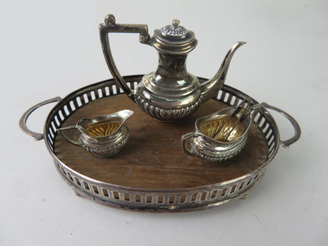 I haven't seen one of these tea sets in a long time. The oval tray has a great railing around the sides and a wooden center. The handles are designed to be light in weight and there are 4 balls on the bottom of the tray. The teapot is large and elegant with a high spout and large handle. An abundance of raised designs are found at the base of all of the pieces, really giving more elegance. The sugar bowl has handles on the sides and is more oval shape, but it never had a cover. (This was typical in the early days as they could use a spoon or tongs to lift out sugar cubes). I have included tongs for the sugar bowl. There are many hallmarks for identification and the word "Sterling".