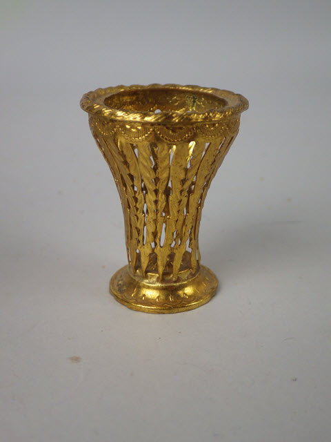 There are many shapes one finds for umbrella stands. This one is similar to a barrel but it tapers to the bottom. Under the rim are small garlands circulating the entire opening. The remainder of the stand is done in long small strips of ormolu leaves attached at each end. The top and bottom are very sturdy and will hold umbrellas nicely.