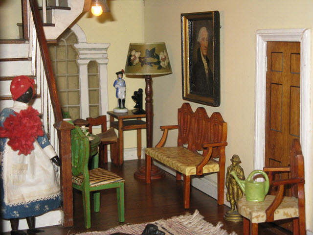 the mahogany stain on the rest of the settee. Above the settee is a wonderful Tynietoy portrait of George Washington. Oh my, another