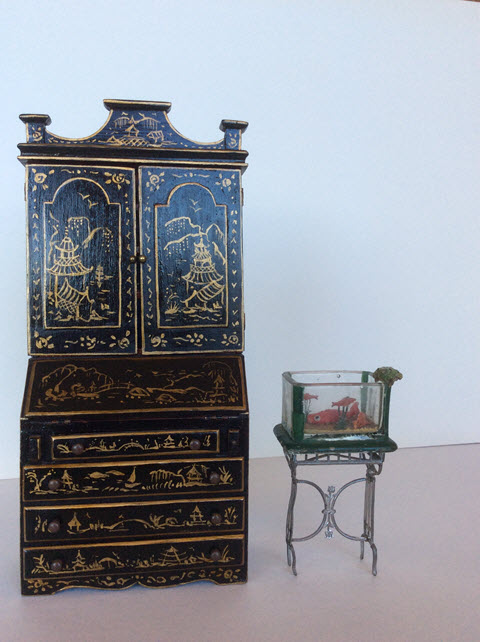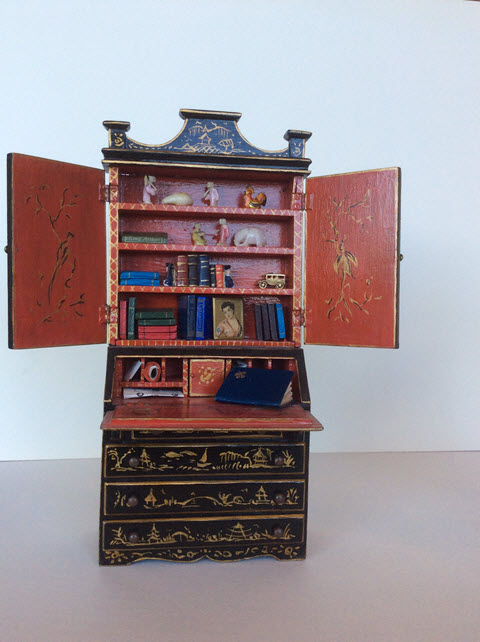 We can now see an ebony painted Tynietoy Japanned secretary in one photo and view the interior in red with gold painted motifs.