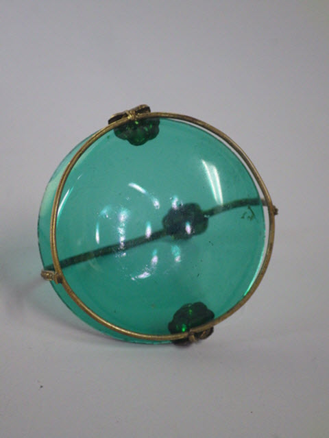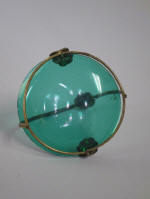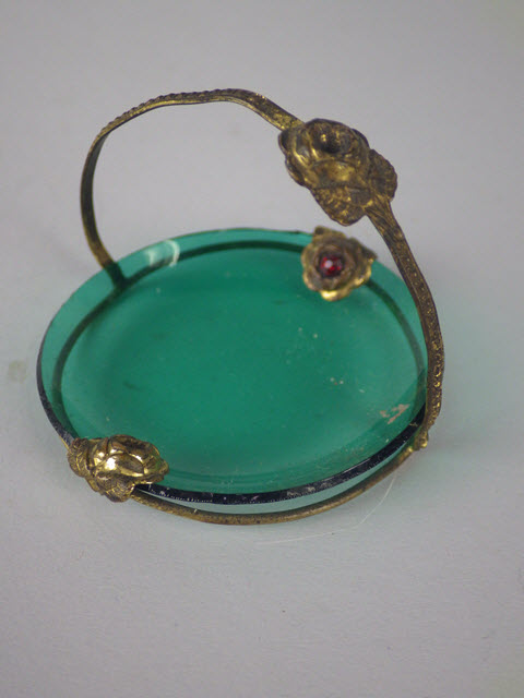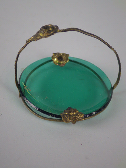 The circular green glass is held in a frame that encircles the bottom of the dish. On two sides are two ormolu flowers that clamp the dish to the frame. A half circle handle is mounted on the other sides of the dish to keep it in place.  At one time here were stones in the flowers, One red stone remains in one of the flowers on the dish. I have never seen this piece before and it was quite expensive to purchase.