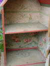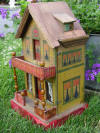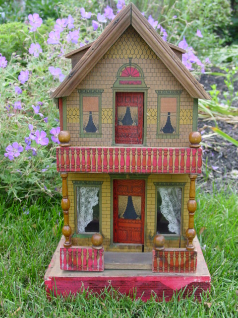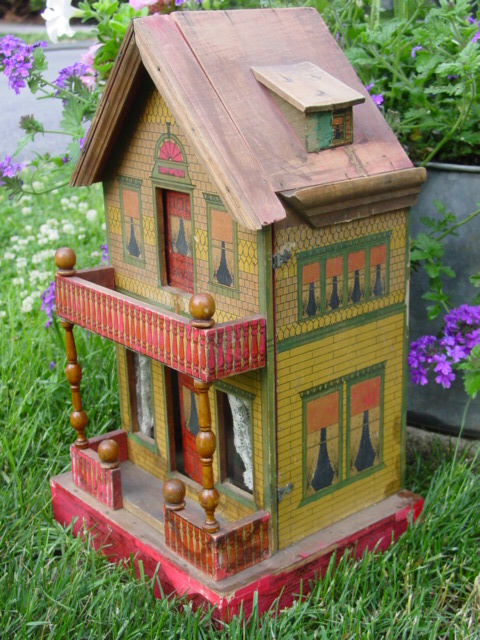 This lithograph two room doll's house has the look of a Bliss house and was made about the same time as Bliss, but the maker is unknown. What makes it different from a Bliss besides the different lithography papers, is the molding that appears where the gutters on a full size house would be. Thus, the term "Gutter Houses" has been coined to these houses. The lithograph papers on the main part of the house are very nice; clear and crisp. (The base and the dormers have missing papers and the base is over-painted). Tan paper appears on three sides of the house with lined bricks on the first floor and a combination of brick and shingles on the second floor. The trim work is done in a dark green. All the windows that have lithograph paper of curtains and shades which are found on three sides of the house. The two open windows on the first floor in the front have isinglass glass and curtains.